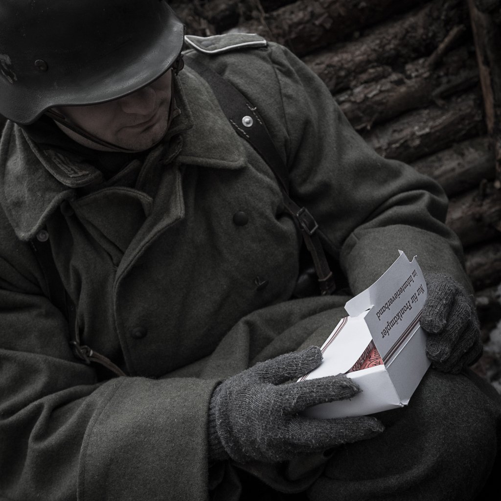 A reproduction of a cardboard box labeled "Für Frontkämpfer im Großkampf" ("For frontline fighters in major battles") and "Nur für Frontkämpfer im Infanterieverband" ("Only for frontline fighters in infantry units"). These inscriptions were used on packages containing sweets, tobacco, or other bonus rations intended for soldiers deployed directly on the front line.