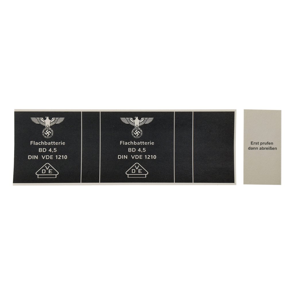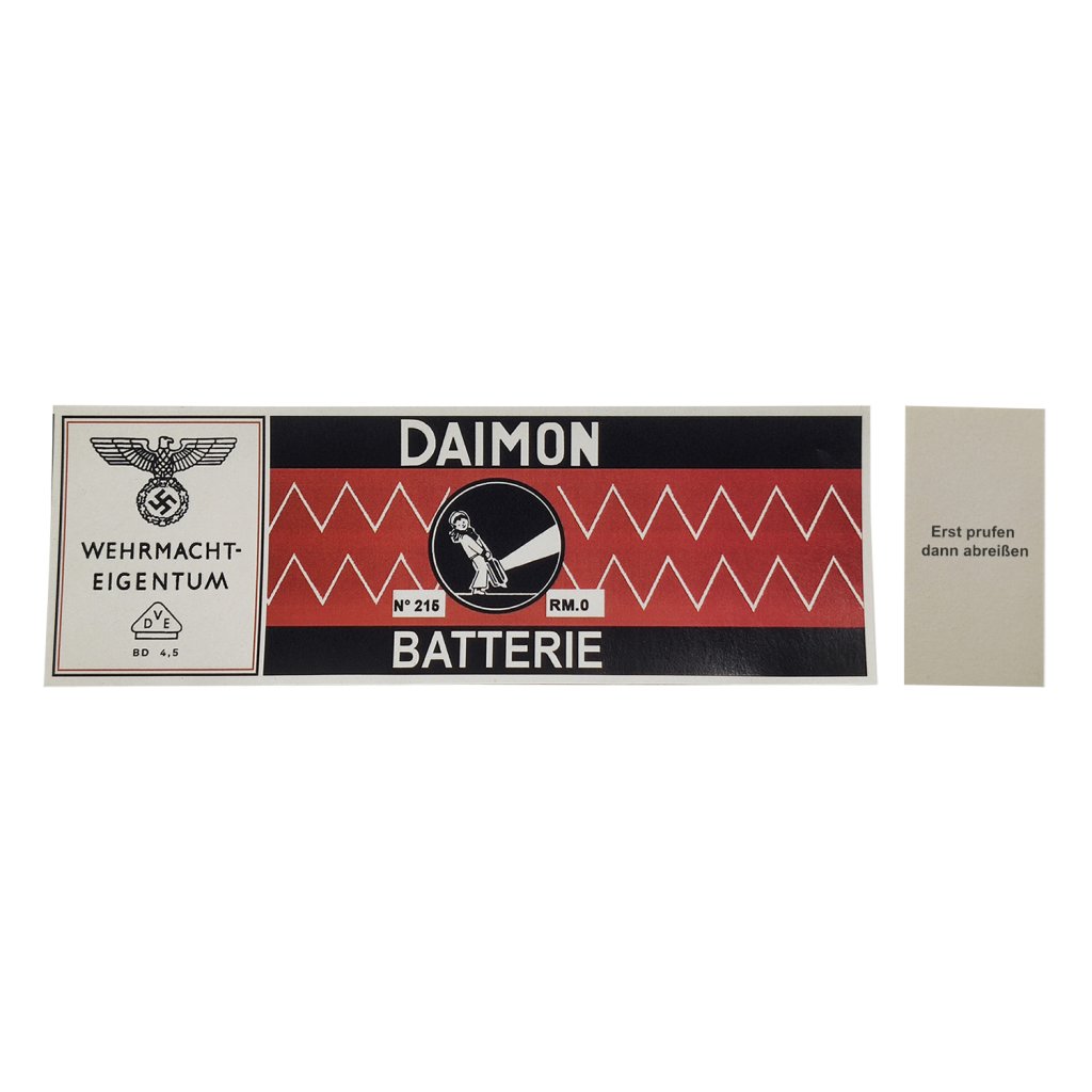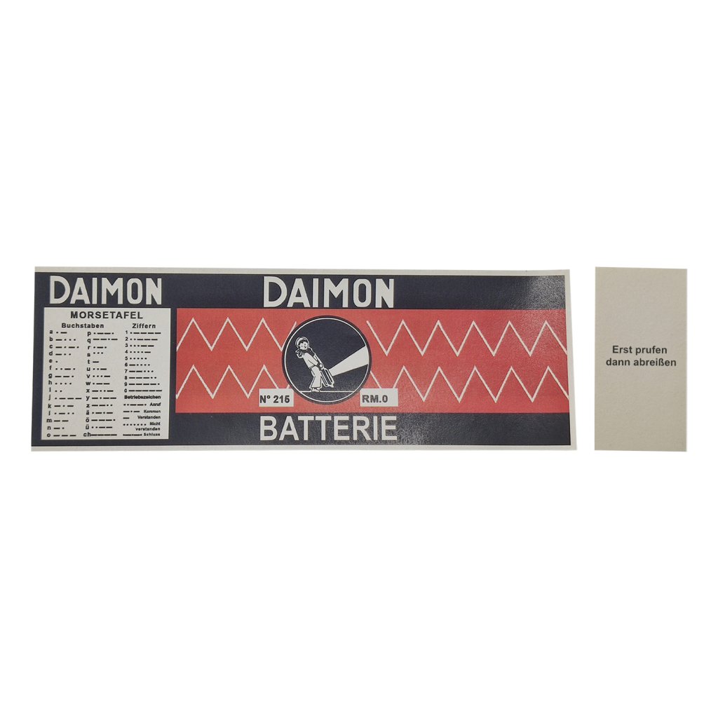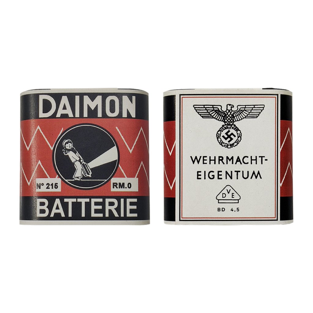 Reproduction of the flat 4.5V battery used by the German army during World War II. Two versions are available: one featuring the Daimon brand logo, and another marked “Wehrmacht” with a printed Morse code chart. Both sleeves are designed to fit over modern 3R12 batteries, instantly transforming them into historically accurate props.