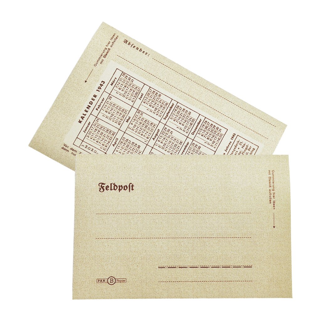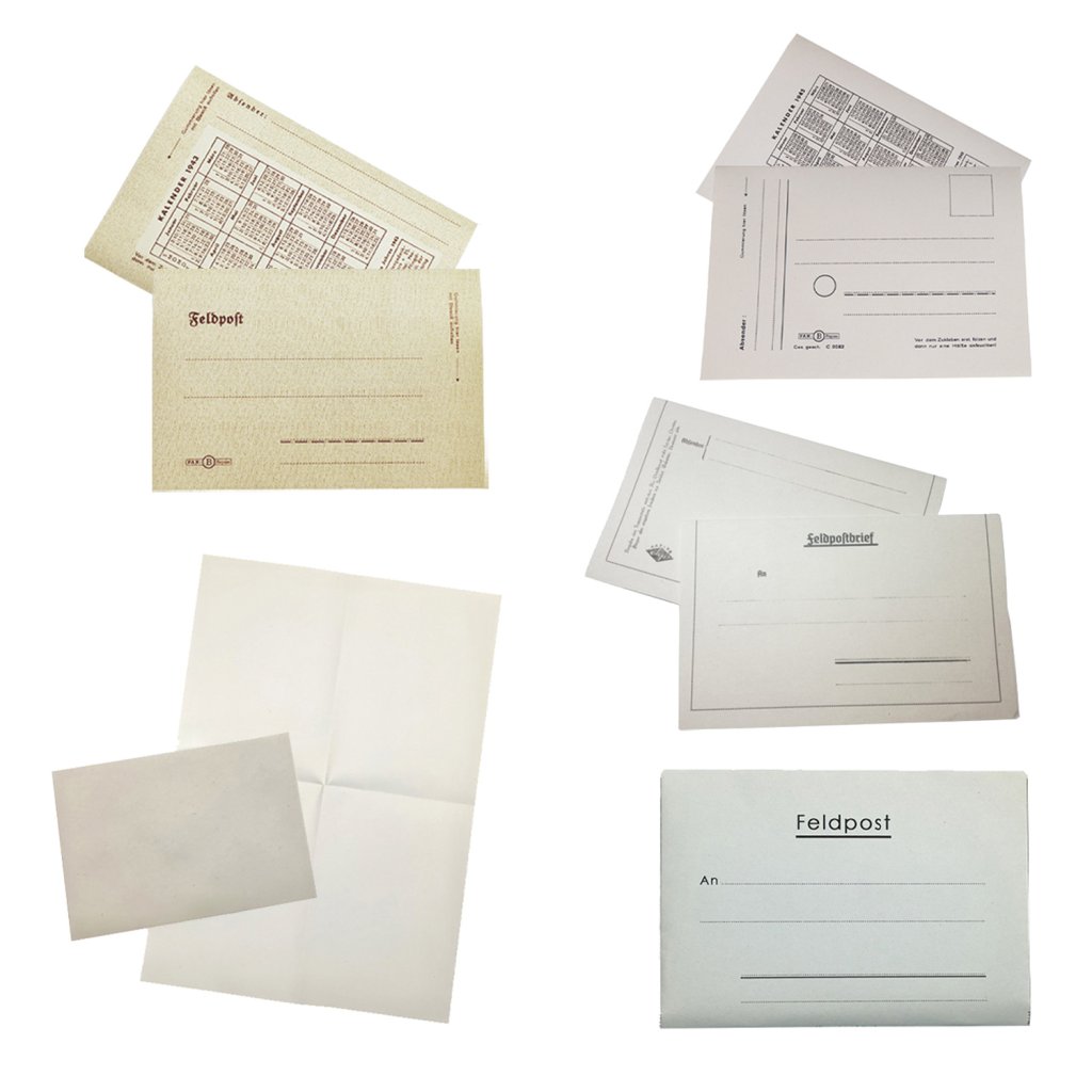 Reproduction of various types of German WWII field mail letters (Feldpostbrief), used by Wehrmacht soldiers to send correspondence home. These letters were designed specifically for use in the military postal system, often pre-printed with address fields and sections for censor approval.