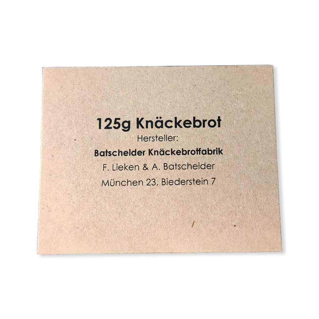 A reproduction of the dry, long-lasting bread packaging – known as Knäckebrot – in the typical style used by the German army during the Second World War. Each package contained 125 grams, matching the standard individual soldier’s ration.