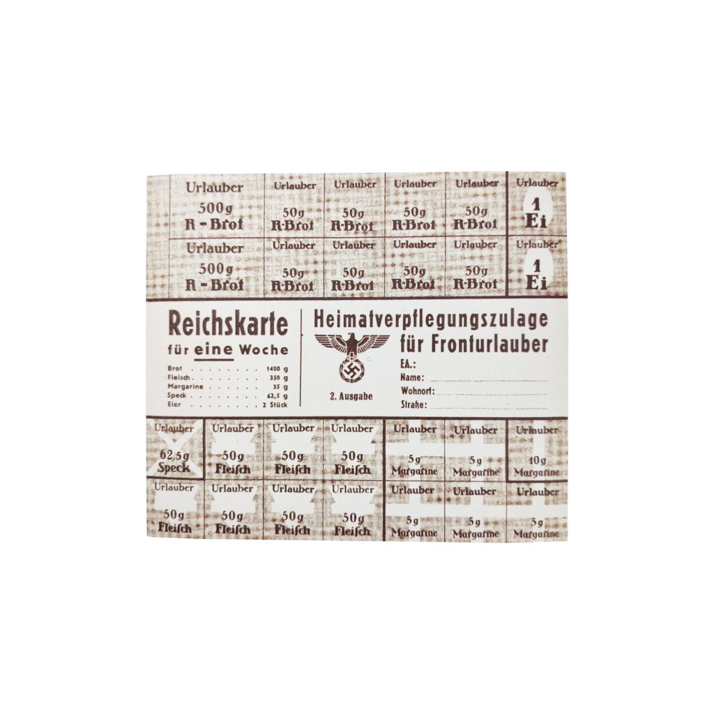 These replicas of ration coupons (Lebensmittelkarte) represent some of the most authentic accessories for anyone dedicated to WWII reenacting or collecting. During the era of total war and the rationing system, possessing money was secondary; the key document was this card, which determined the entitlement to a specific amount of basic supplies.