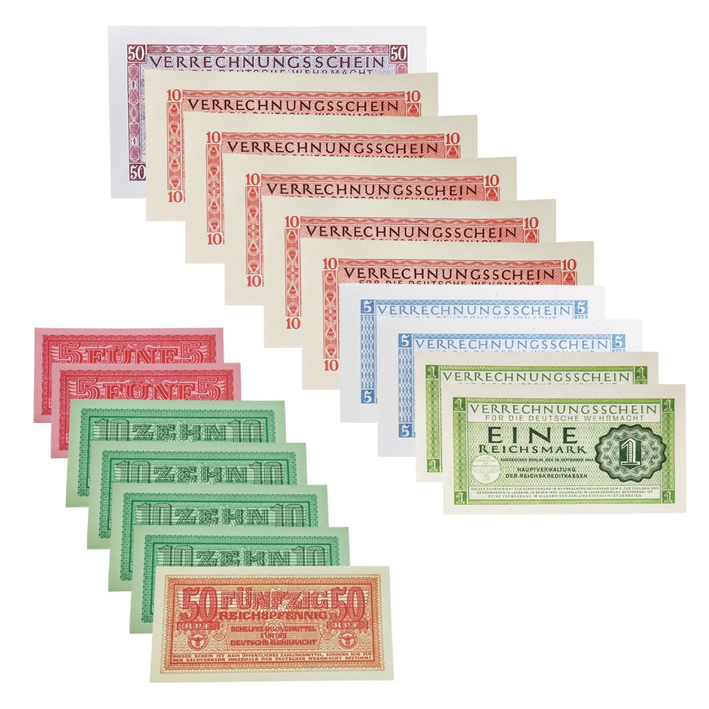 A reproduction set of Wehrmacht accounting notes (Verrechnungsscheine) used during World War II. German soldiers did not receive or use standard civilian currency while on duty. Instead, they were paid with special military-issued banknotes, redeemable in military canteens, post offices, or sent home.