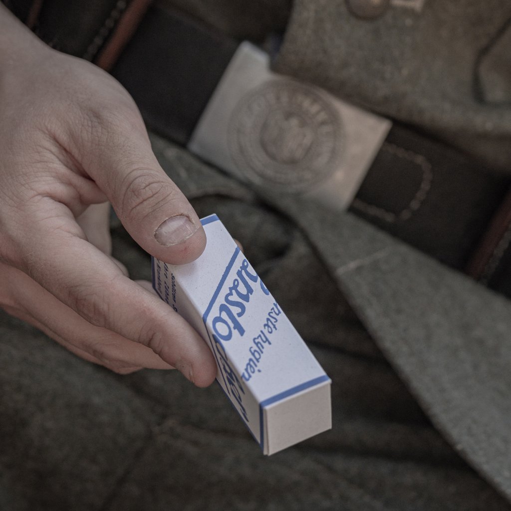 The packaging is based on authentic wartime designs, including typography and the period-typical hygiene warnings that were emphasized at the time to maintain troop readiness. This is a highly authentic replica, suitable not only for reenactment kits but also as a prop for historical films, exhibitions, or themed displays.