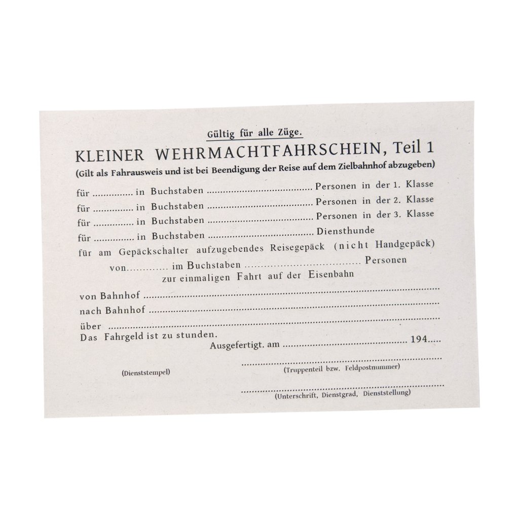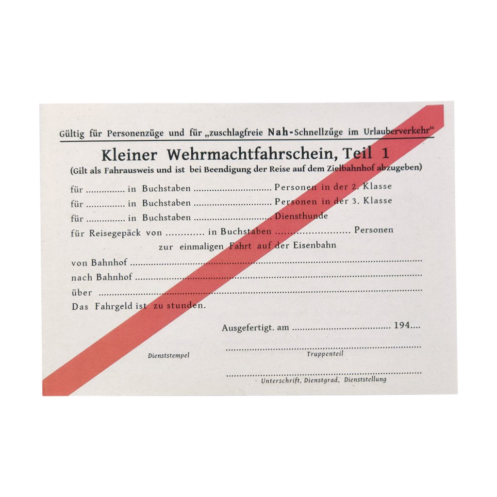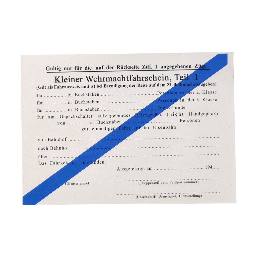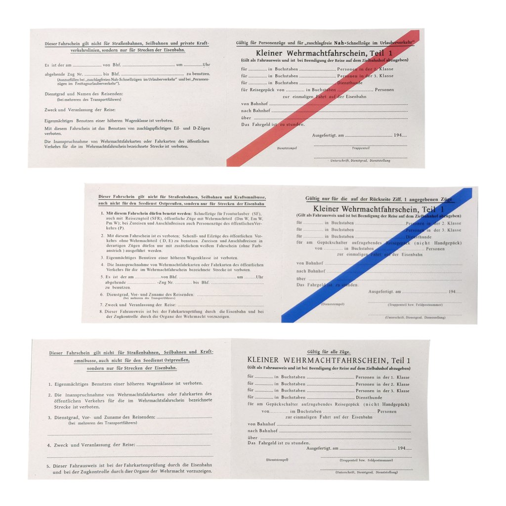 These faithful reproductions of the Kleiner Wehrmachtfahrschein represent an essential part of the personal documentation of any German soldier traveling by the Reich railways (Deutsche Reichsbahn). Whether traveling on leave (Urlaub), transferring to another garrison, or returning from a field hospital, soldiers were required to carry a valid ticket corresponding to the train type and distance. We offer three historically accurate variants distinguished by color coding.